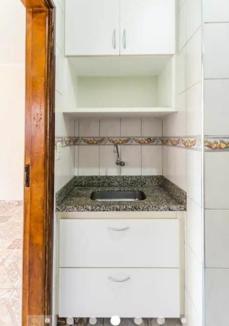 Na cozinha tem armário em cima e em baixo da pia, com espaço para microondas.